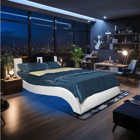 Constructed with high-quality faux leather upholstery and a sturdy wooden frame, this platform bed offers both elegance and durability. The padded headboard ensures comfort for reading, watching movies, or lounging, while the built-in LED lights provide ambient illumination, perfect for setting the mood.